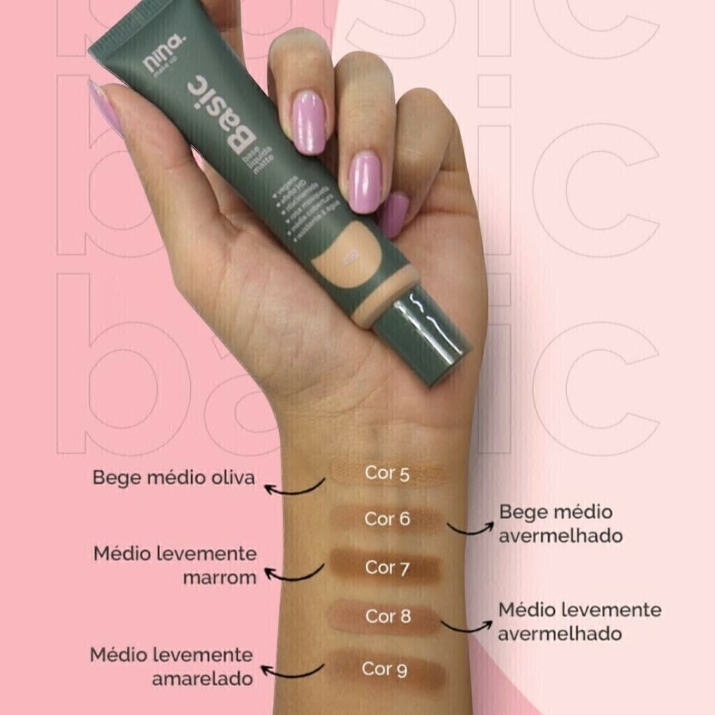 A Base Líquida Basic da Nina Makeup é um produto de maquiagem que oferece uma cobertura leve a média, ideal para quem busca um acabamento natural e suave, sem pesar na pele. Ela é uma opção versátil, que pode ser usada para o dia a dia, proporcionando um efeito mais leve e discreto.