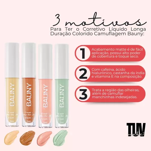 O Corretivo Camuflagem Bauny Salmão é um corretivo de alta cobertura, especialmente formulado para neutralizar imperfeições e criar um acabamento uniforme na pele. A tonalidade salmão é ideal para disfarçar olheiras com tons mais escuros, azulados ou arroxeados, como aquelas olheiras profundas, ajudando a iluminar a área dos olhos de forma natural e eficaz.