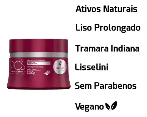 A Máscara de Tratamento Pós Progressiva da Haskell foi criada especialmente para cuidar dos fios que passaram por processos de alisamento. Sua fórmula ajuda a repor a nutrição e a hidratação perdidas, prolongando o efeito liso e garantindo cabelos mais saudáveis, macios e com brilho intenso. Com ação antifrizz, recupera a vitalidade dos fios e mantém o movimento natural, sem pesar.