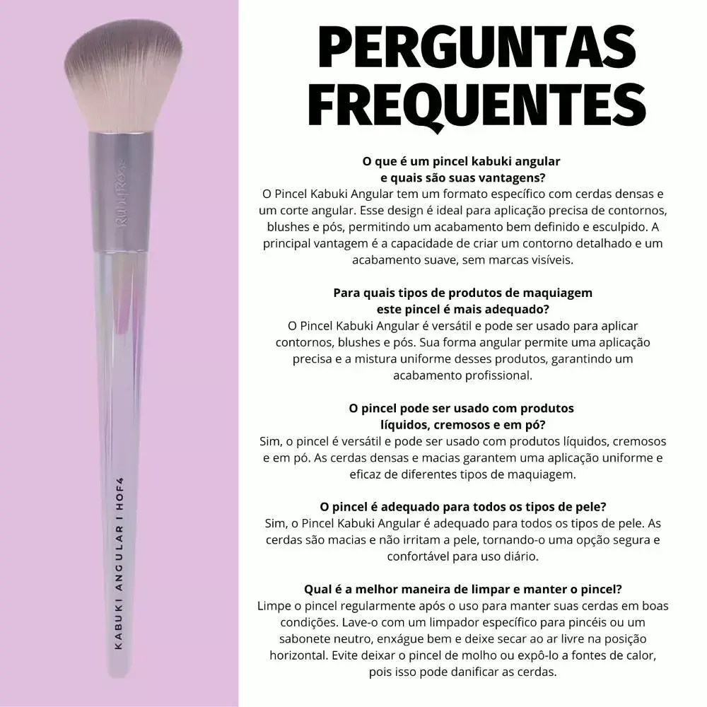 Aplique o produto desejado diretamente na pele ou nas cerdas do pincel e espalhe com movimentos firmes e circulares, acompanhando o formato do rosto. Utilize a parte chanfrada para definir e contornar com precisão. Após o uso, limpe regularmente para manter a maciez e prolongar a vida útil do pincel.