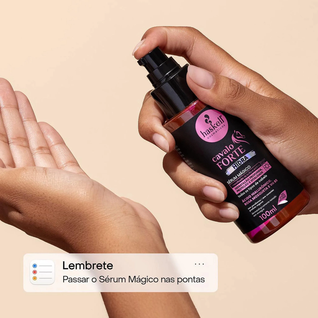 Dica: Combine o Sérum Mágico Hidra Cavalo Forte com o shampoo e condicionador da linha Cavalo Forte para potencializar os resultados e garantir cabelos mais fortes, hidratados e reparados de dentro para fora.