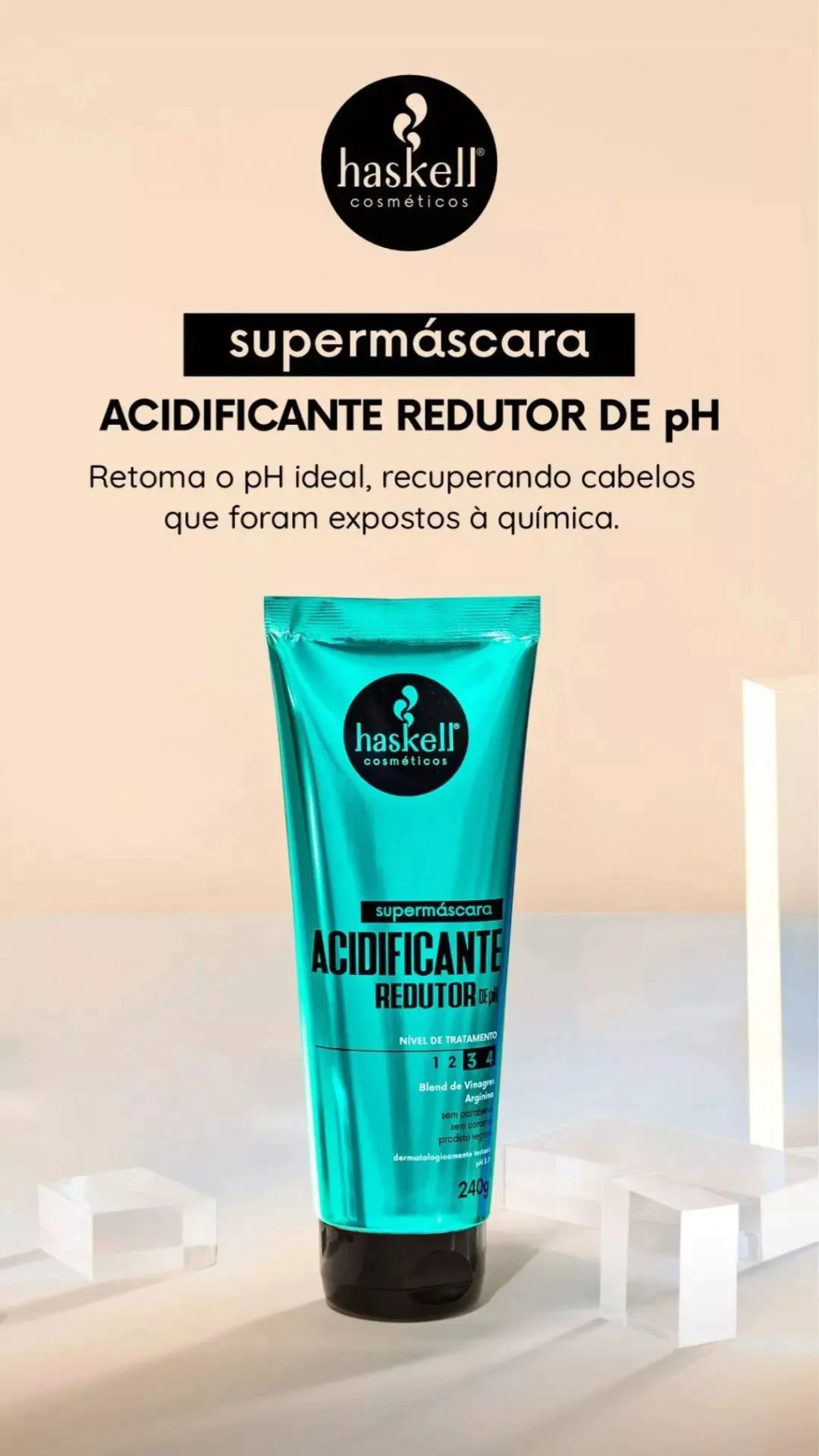 Dica: Para um tratamento ainda mais completo, use a Supermáscara Acidificante Redutor de pH em conjunto com outros produtos da linha Haskell, garantindo uma recuperação completa dos fios e mantendo a saúde capilar após processos químicos.